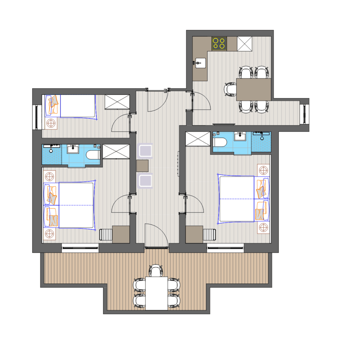 Appartement type I is ideaal voor gezinnen of kleine groepen. Het bevindt zich op de zolder en biedt plaats aan maximaal vijf personen met twee tweepersoonskamers en een eenpersoonskamer. De badkamers hebben een douche/toilet en zijn erg licht dankzij de dakramen. Het balkon op het zuiden biedt veel zon en uitzicht op de bergen van het Zillertal.